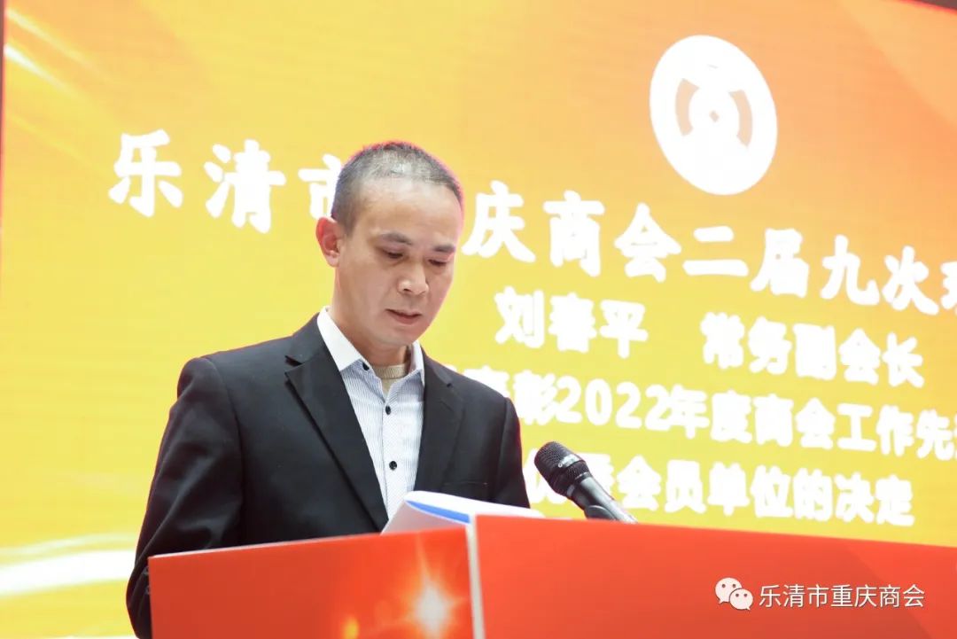 刘春平宣读《关于表彰2022年度商会工作先进小组及优秀会员单位的决定》并颁牌颁奖。