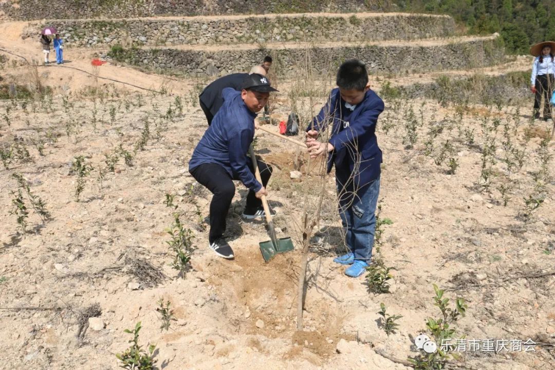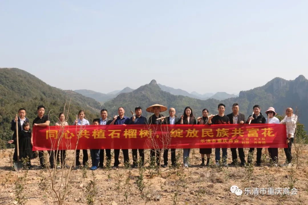 植树现场一派热火朝天的劳动景象,大家分工明确,有的扶正树苗,有的培土踩实,乐清市重庆商会共栽种石榴树100余株。大家还纷纷和自己亲手栽种的树苗合影留念,挂上纪念标语。
