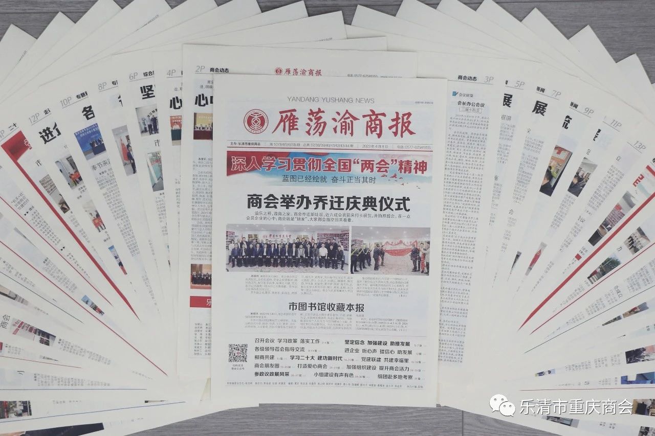 4月8日,由乐清市重庆商会主办的《雁荡渝商报》2023年第1-8期(总37-44期)正式出版发行。本期发行的《雁荡渝商报》共8期32版,全面总结报道商会2022年4月至2023年3月的工作开展情况。