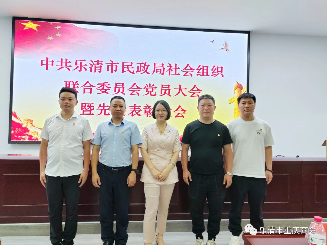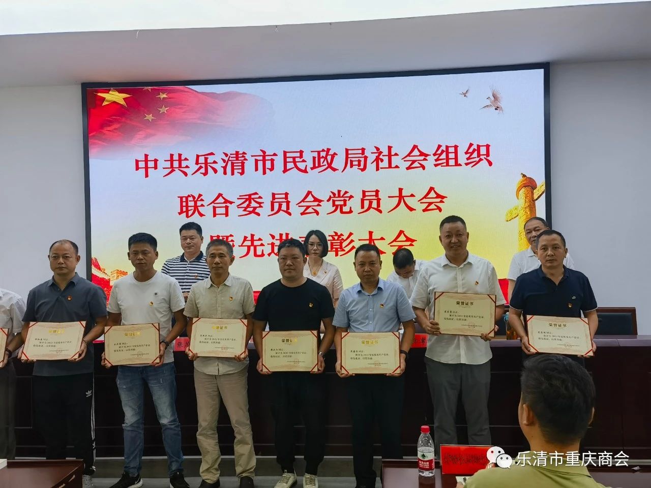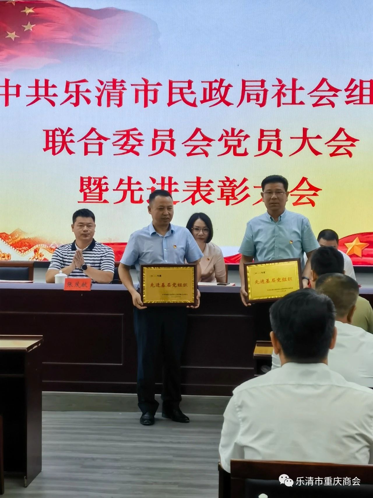 会议表彰了先进集体和先进个人。乐清市重庆商会党支部获评2022年度“先进基层党组织”,党支部书记吴建波和党员颜大江被评为2022年度优秀共产党员。