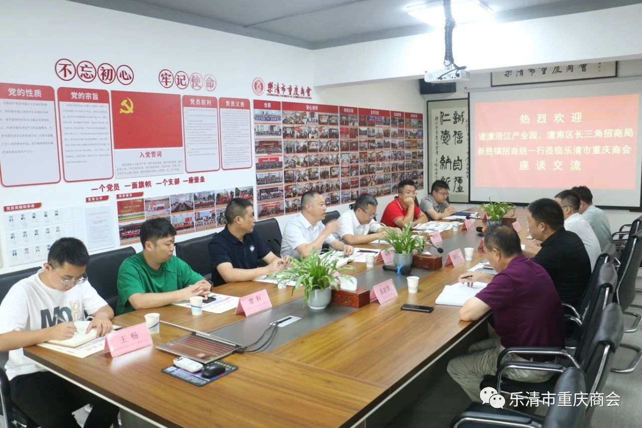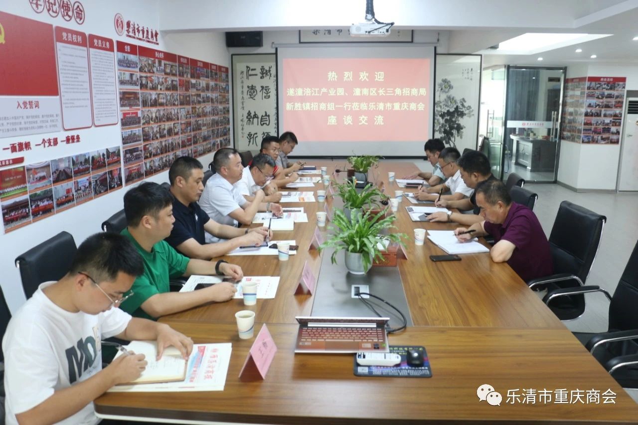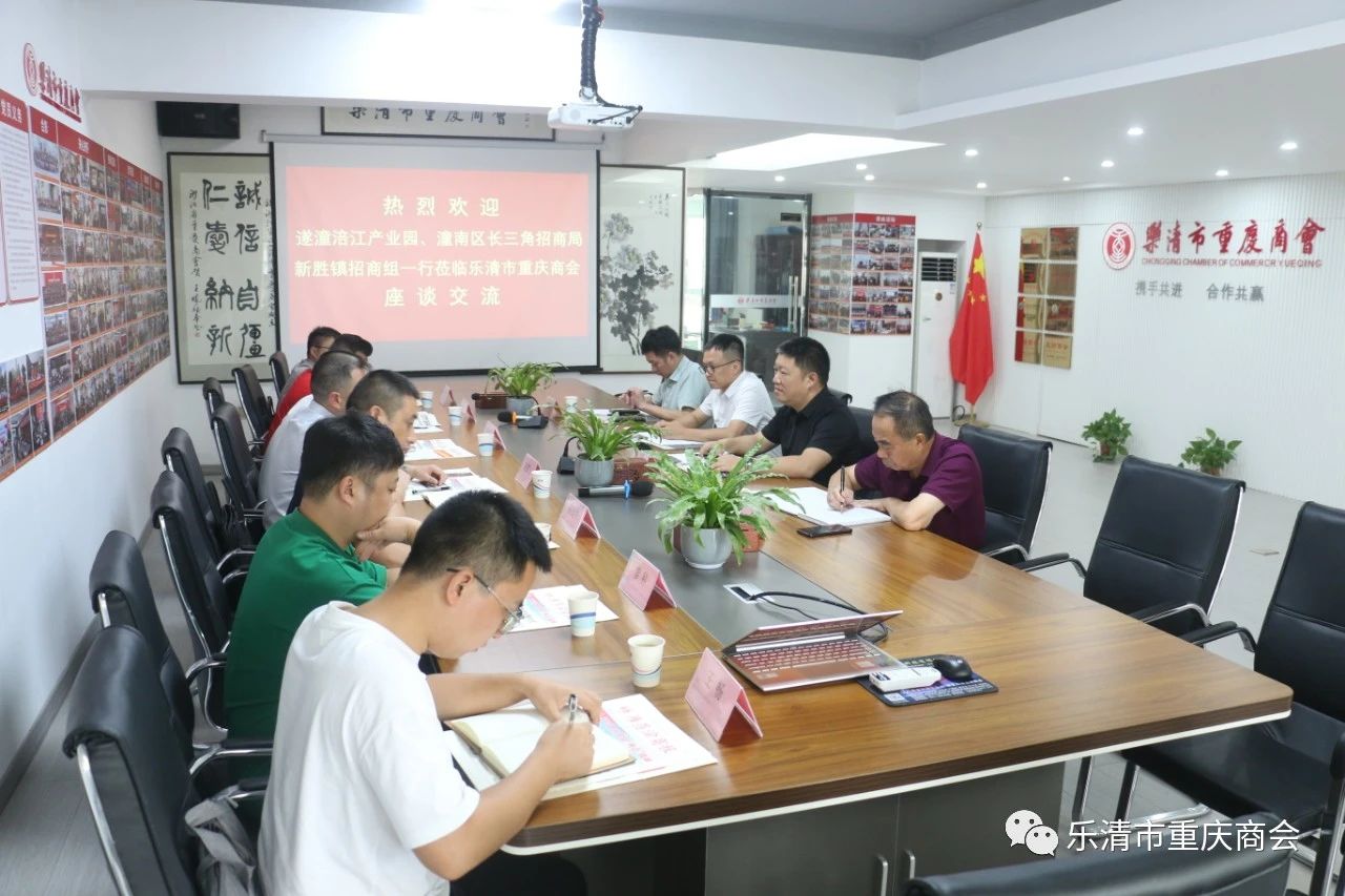 8月21日下午,重庆市潼南区高新区管委会党工委委员、副主任、遂潼涪江产业园区筹委会副主任刘继军,潼南区新胜镇党委副书记、镇长黄强,潼南区高新区管委会副主任、长三角招商局局长陈鹏飞等一行七人,莅临乐清市重庆商会座谈交流。