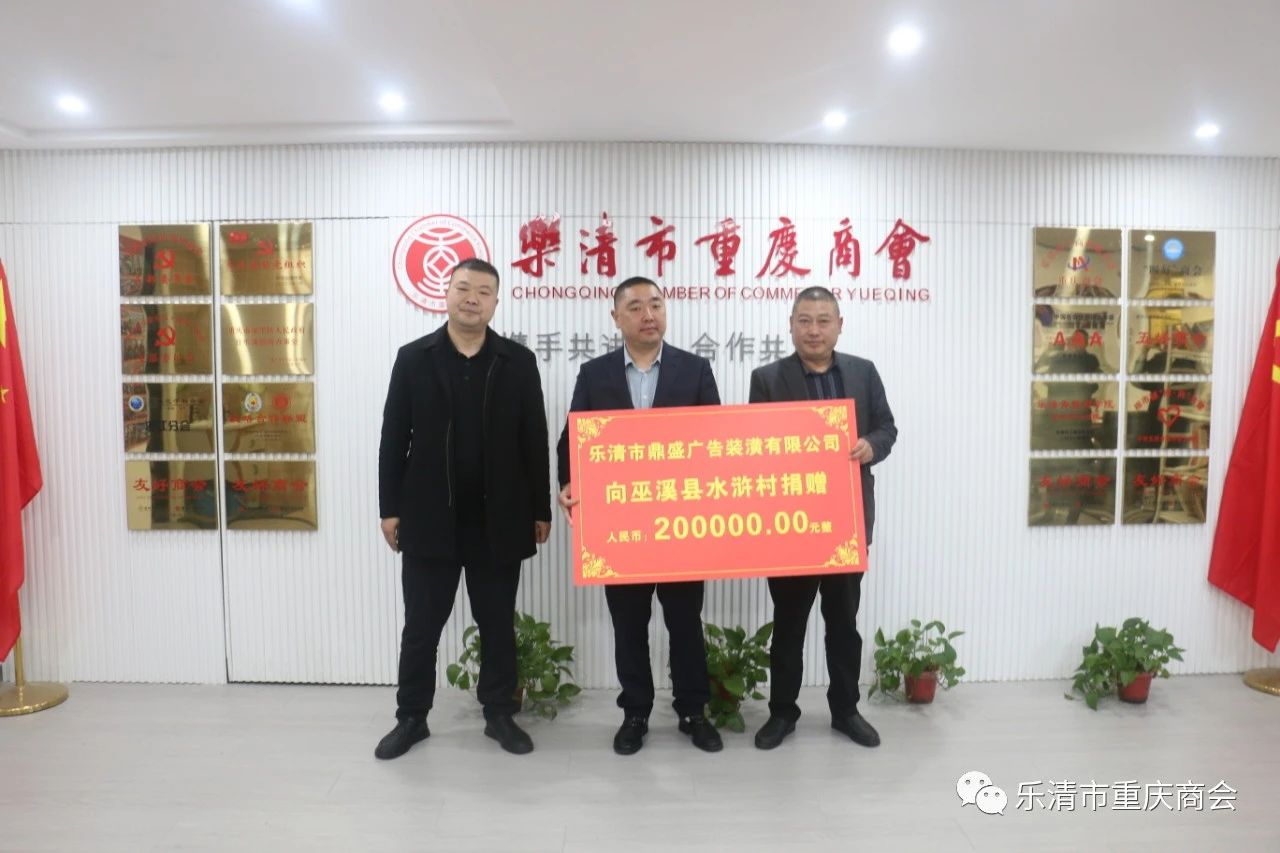会议,还举行了捐赠仪式,常务副会长、乐清市鼎盛广告装潢有限公司董事长彭祥圣向巫溪县乌龙乡水浒村捐赠20万元人民币。