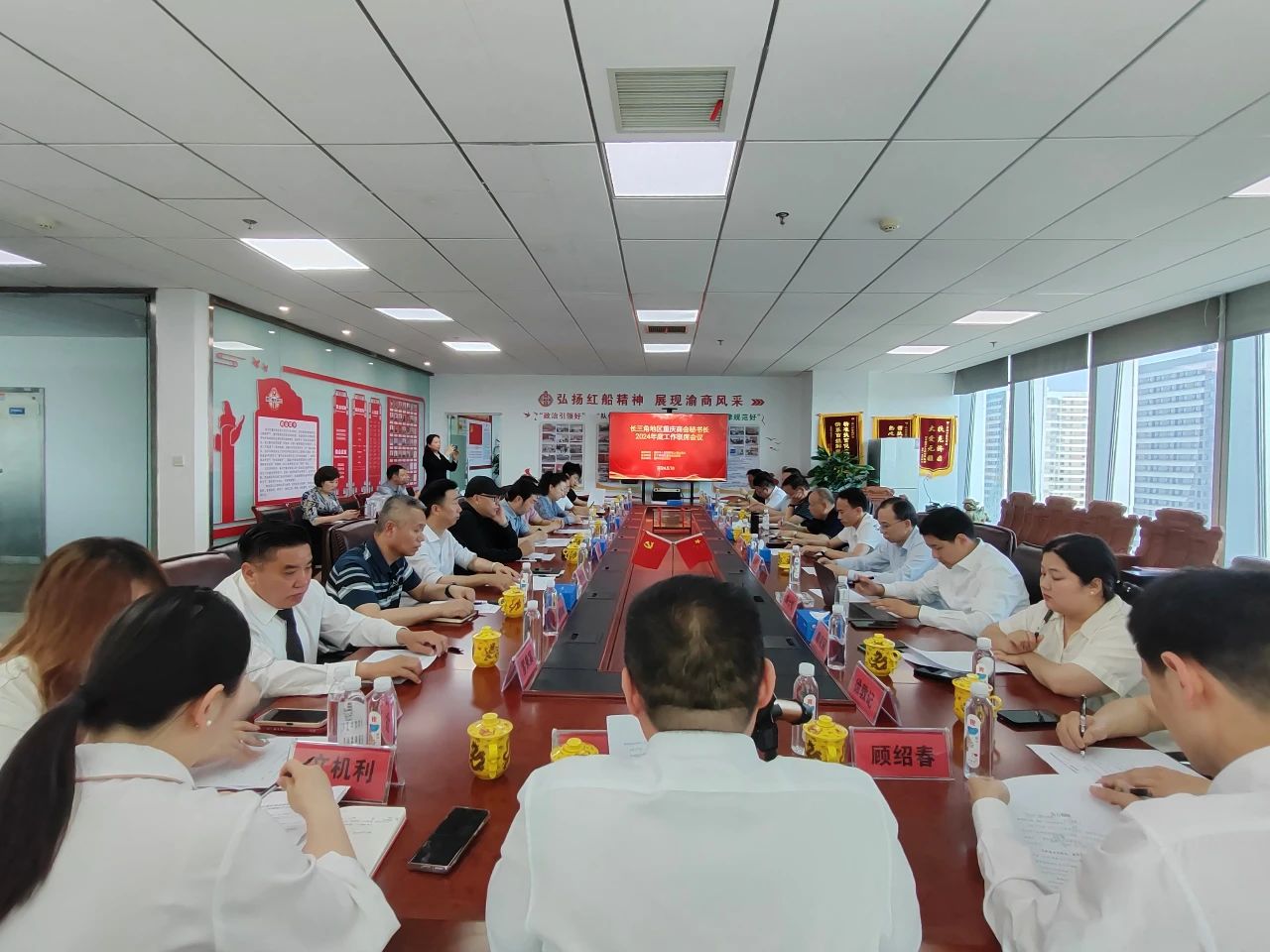 乐清市重庆商会秘书长李海波,与嘉兴市重庆商会、昆山市重庆商会、宁波市重庆商会、温州市重庆商会、江苏省重庆商会、上海市重庆商会、安徽省重庆商会、杭州市重庆商会、绍兴市重庆商会、台州市重庆商会、浙江省重庆商会、湖州市重庆商会、永康市川渝商会、南通市川渝商会、苏州市川渝商会、太仓市川渝商会、常州市重庆商会、义乌市重庆商会、上海市重庆武隆商会、上海市重庆荣昌商会、上海市重庆合川商会、上海市重庆开州商会等秘书长和代表30余人参加会议。