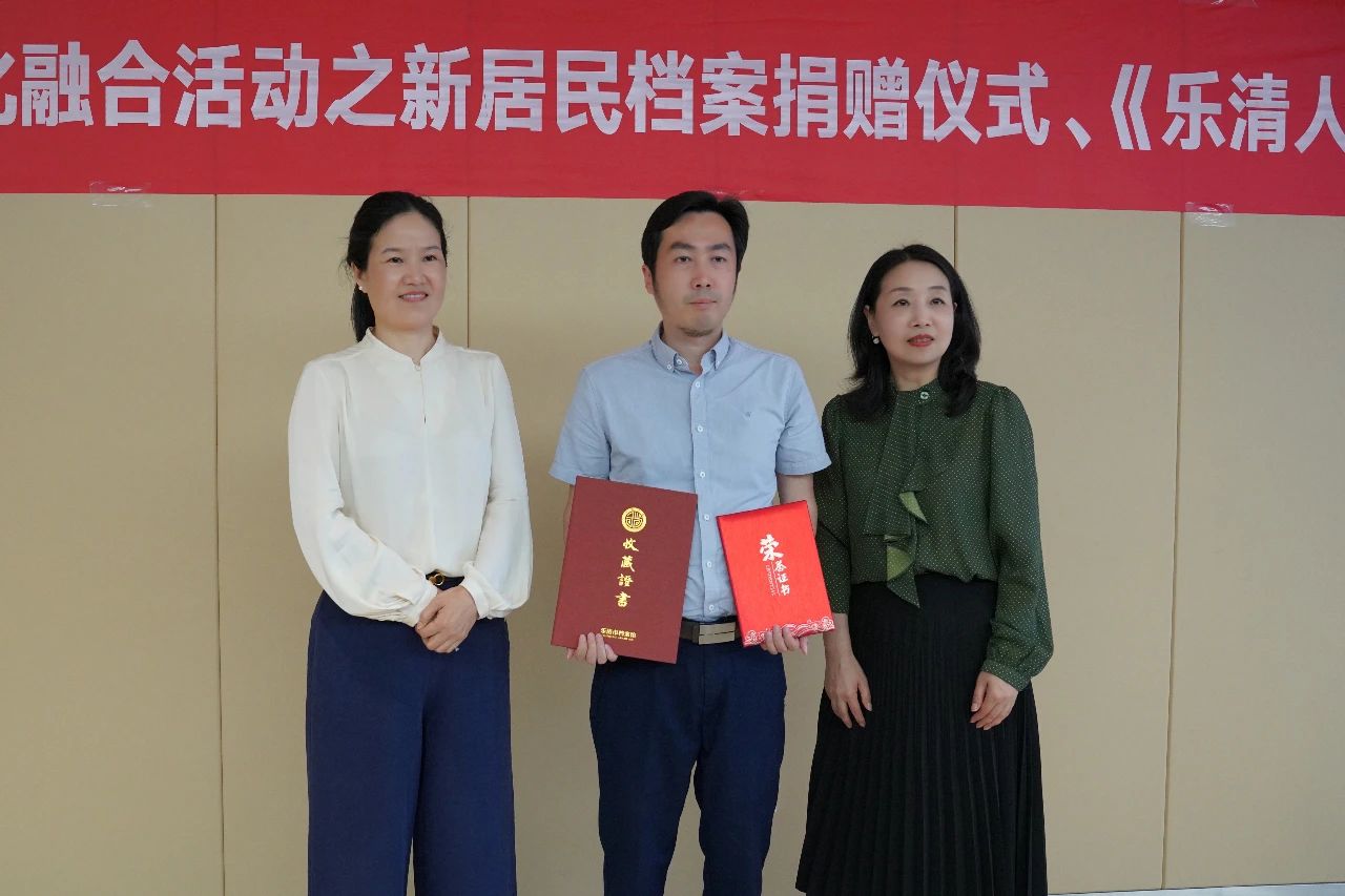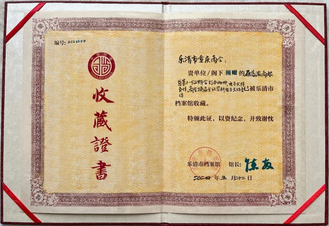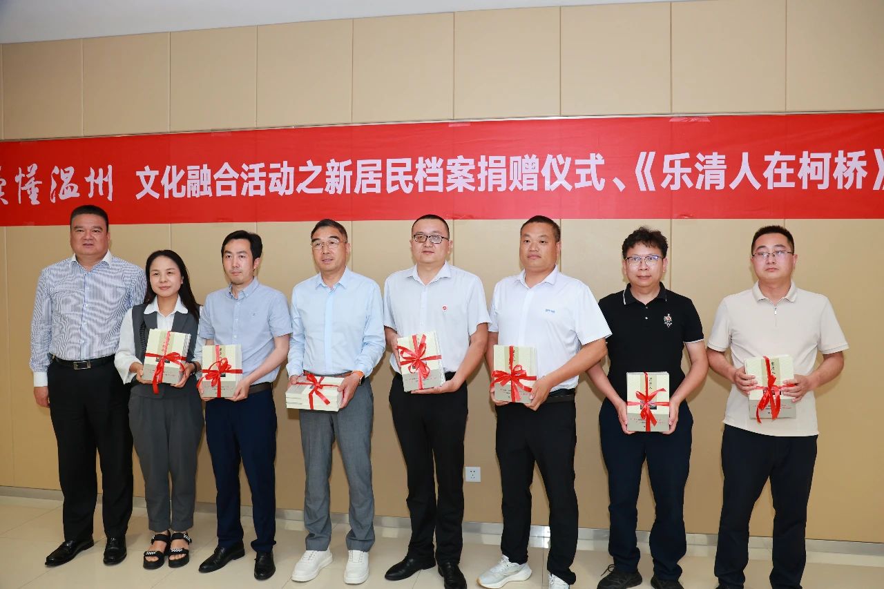 姜巨珍、林回清向捐赠团体、个人分别颁发了收藏证书。李海波代表乐清市重庆商会接受收藏证书。同时,绍兴市柯桥区中国轻纺城乐清商会会长吴建春向乐清市湖南商会、乐清市重庆商会、乐清市安徽商会、乐清市湖北商会、乐清市赣商商会、乐清市亳州商会、安徽省霍邱县驻乐清市流动人口党委赠送《乐清人在柯桥》一书。