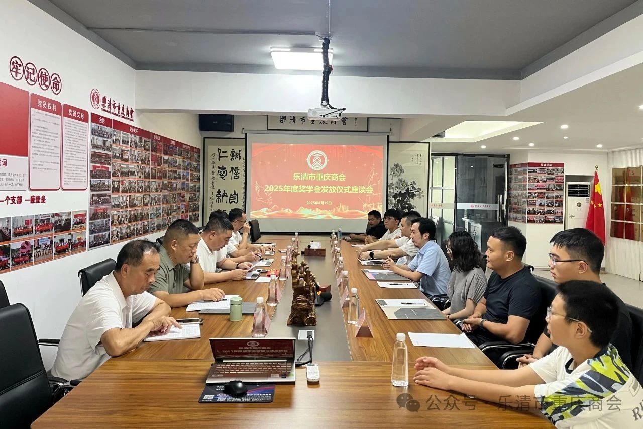 8月19日下午,乐清市重庆商会在商会会议室举行2025年度奖学金发放仪式座谈会。这是商会工会连续第四年举办表彰优秀会员子女的公益活动,旨在弘扬崇文重教传统,增强商会凝聚力,同时为即将步入大学的学子们送上商会大家庭的祝福。