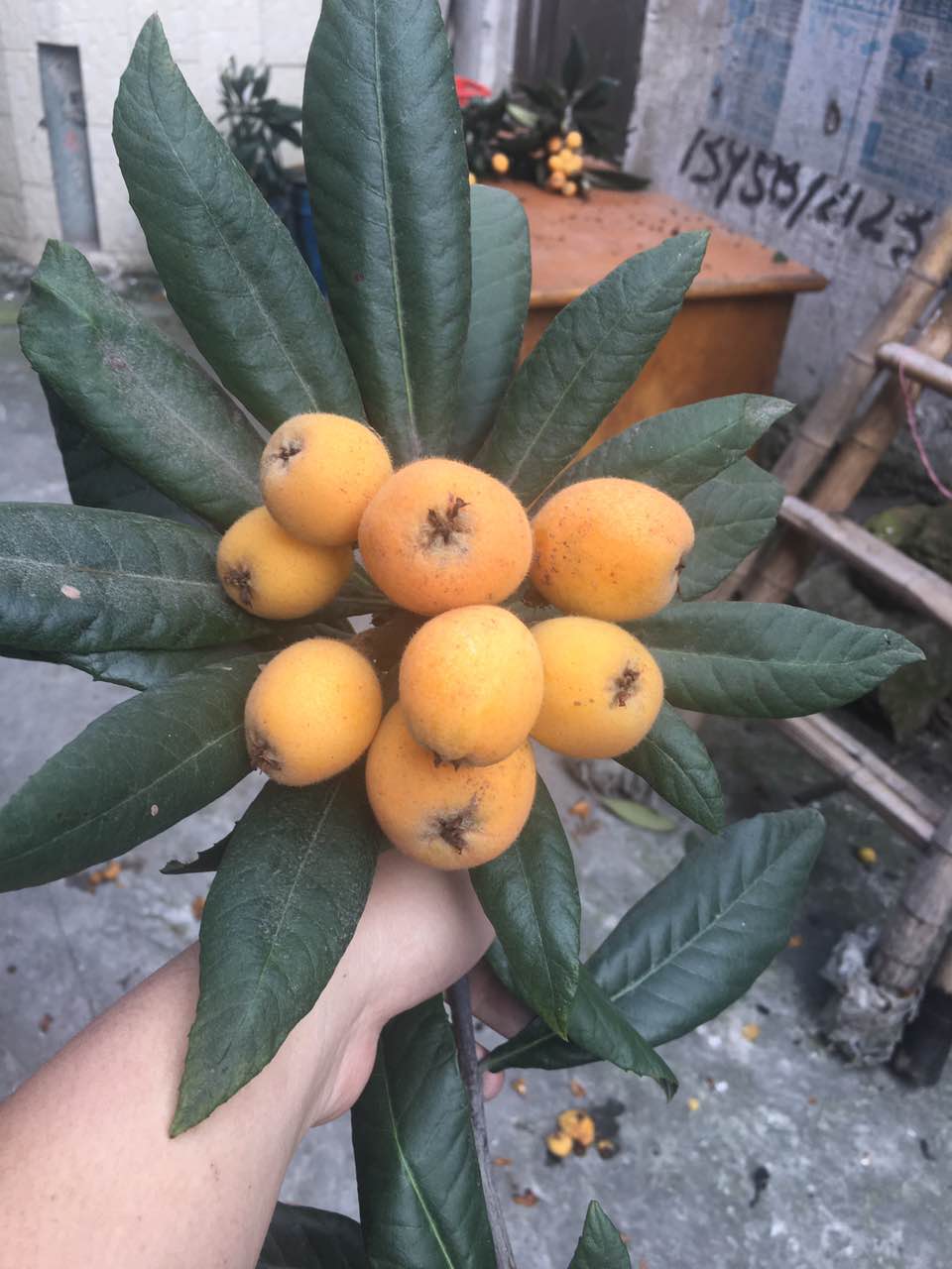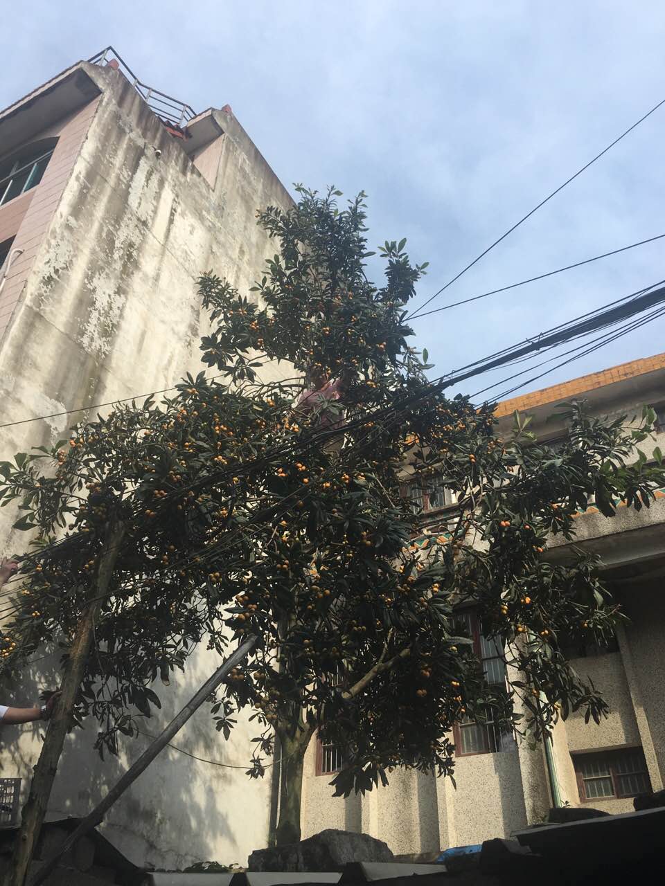 下一站我们来到不远处的枇杷树下,满满的果实让坚硬的老树弯下了腰,树太高的,一时间让人不知所措,就在这时小组成员高扬一跃而上,一时间只见树中一串串枇杷空中落下,让大家大饱眼福的同时还品尝到了枇杷的美味。