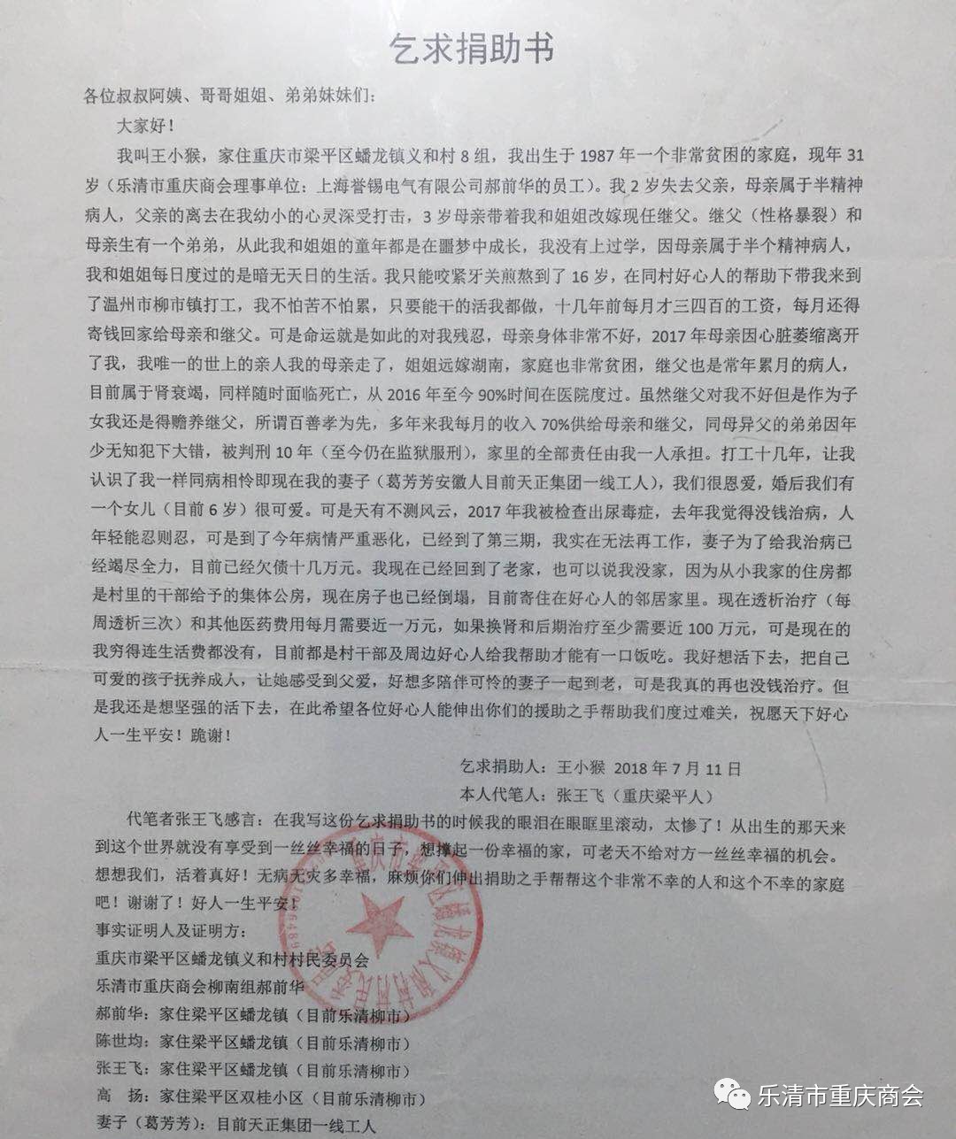 7月11日,一份由商会柳北片区小组成员张王飞代笔的《乞求捐助书》,受到了在乐的重庆人关注和响应。