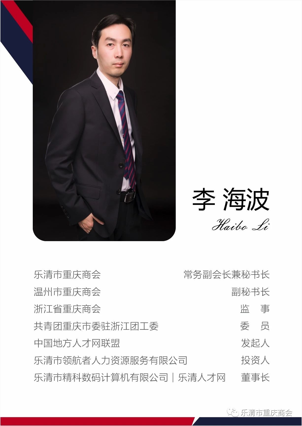 2017年12月27日,乐清市重庆商会召开二届一次会员大会,李海波当选为商会常务副会长兼秘书长。2013年11月,李海波与张成明、胡春波、高文松等乐清渝籍企业家,联合发起成立了乐清市重庆商会。