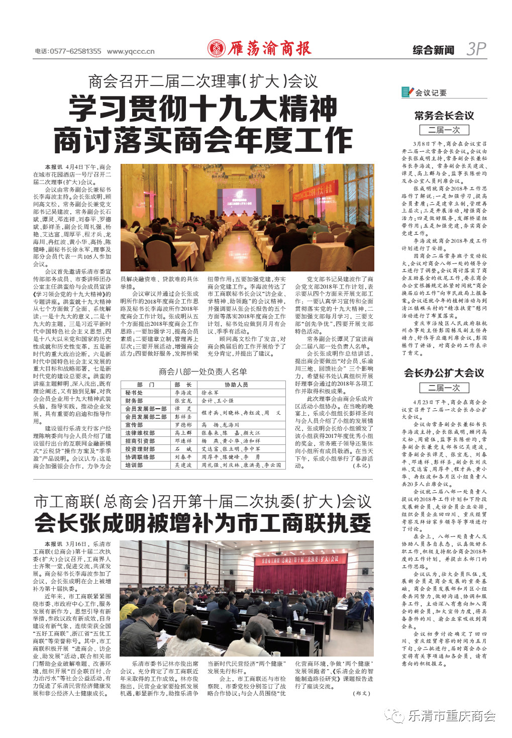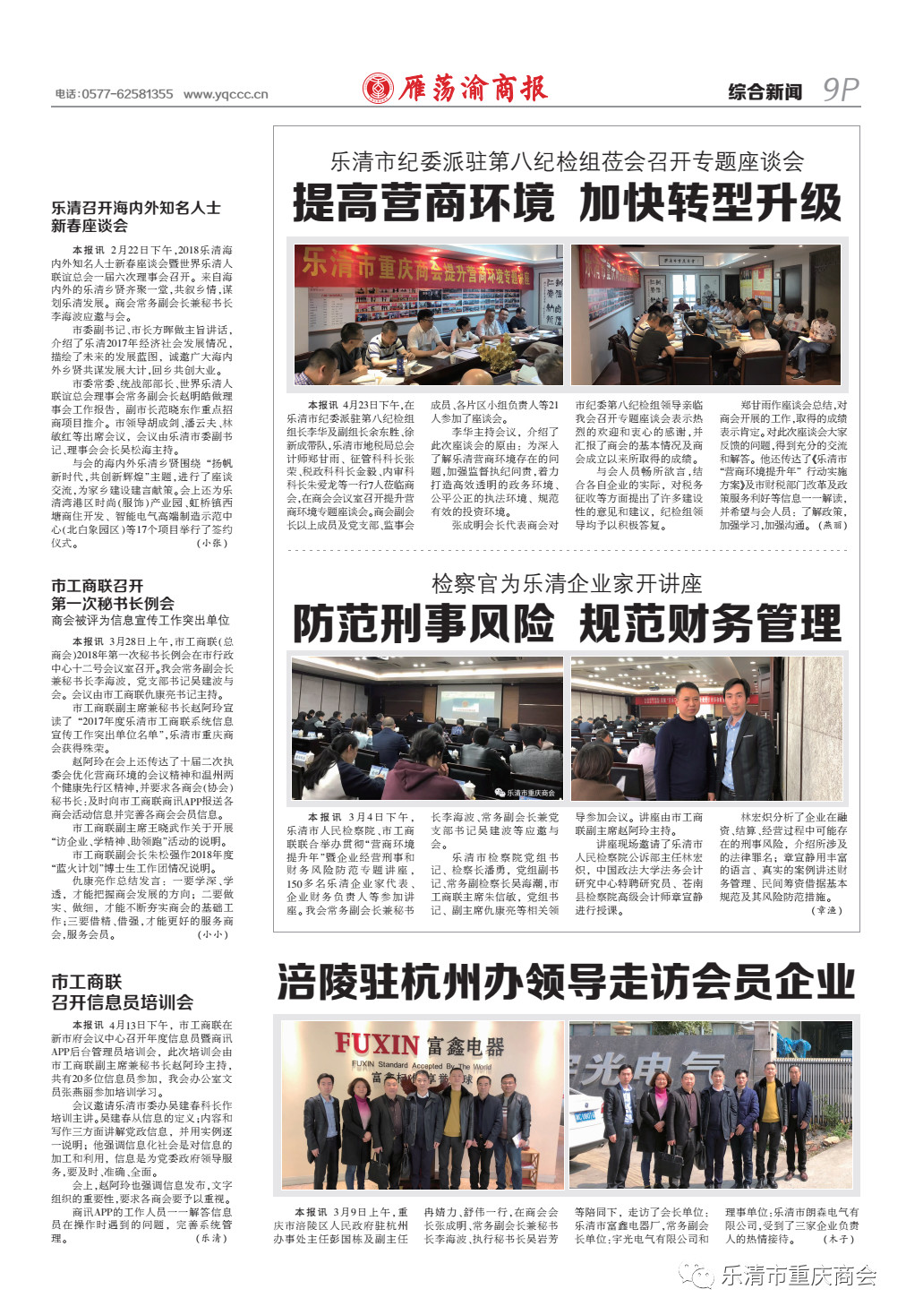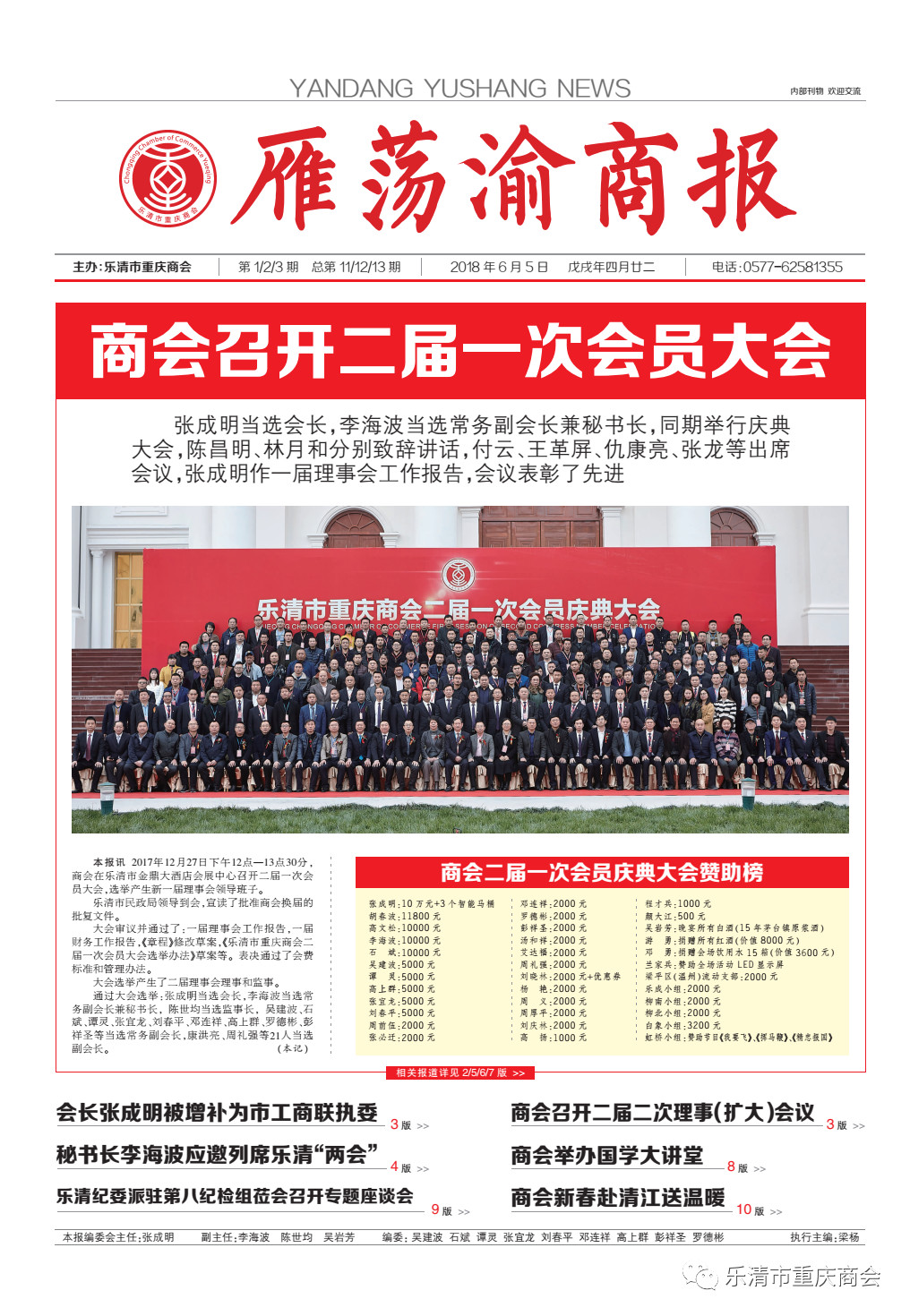 本期发行的《雁荡渝商报》从“商会召开二届一次会员大会”、“商会召开二届一次理事扩大会议”、“会长张成明增补为市工商联十届执委”、“秘书长李海波列席乐清两会”、“商会举办国学大讲堂”、“乐清市纪委派驻第八纪检组莅会召开提升营商环境专题座谈会”、“商会新春赴清江送温暖”等主题新闻为主,全面报道了商会换届以来的工作开展情况和小组活动开展情况。