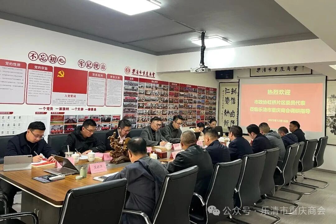 12月16日下午,乐清市政协虹桥片区委员代表倪亮、郑伟、周然、胡旭艳、项国友、胡秀云、连国鹏一行,莅临乐清市重庆商会调研指导并召开座谈会。