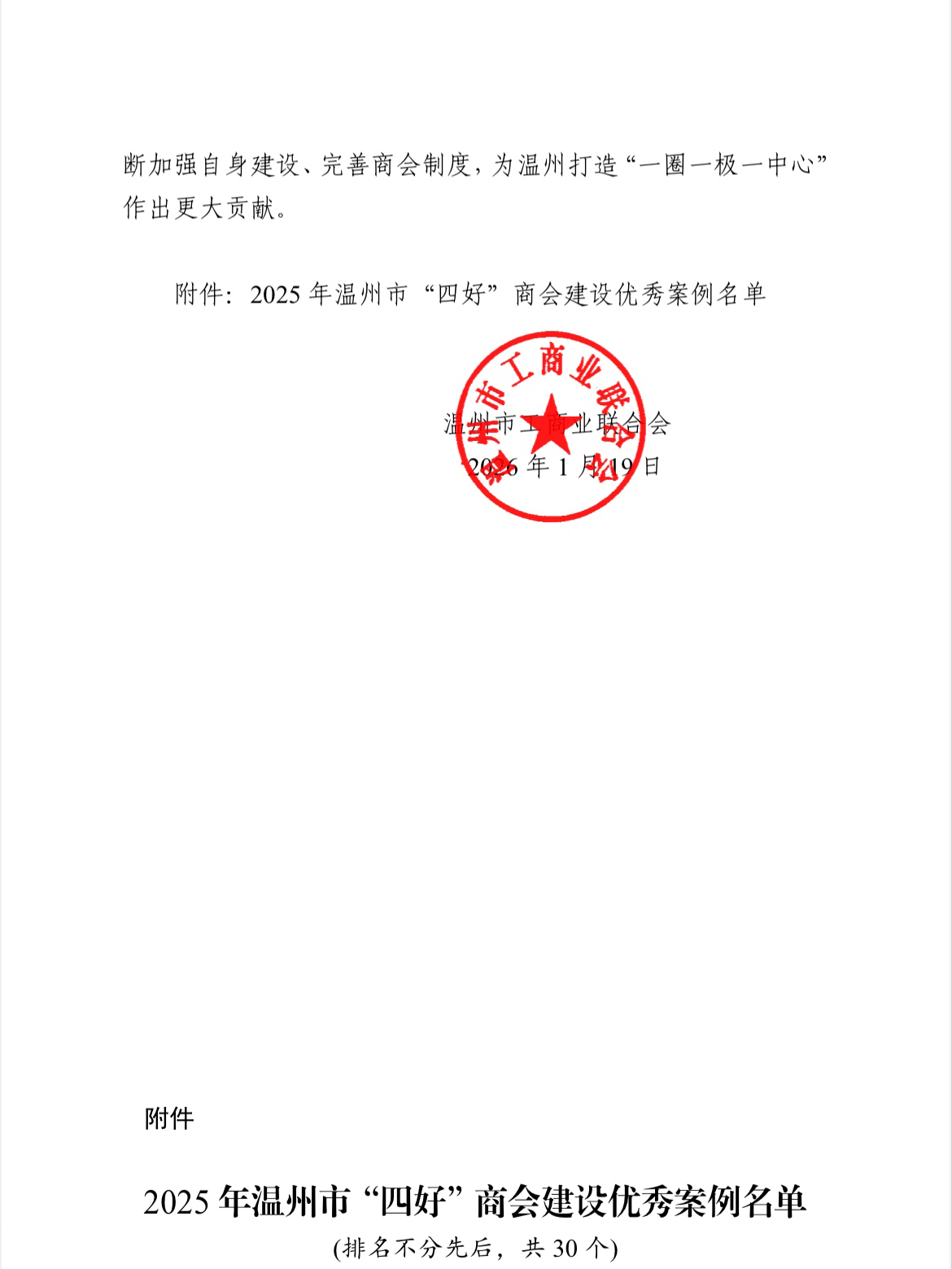 近日,温州市工商业联合会发布《关于印发2025年温州市“四好商会”建设优秀案例的通知》,乐清市重庆商会以“坚守服务初心,凝聚渝商力量”为实践主题,成功入选2025年温州市“四好商会”建设优秀案例。